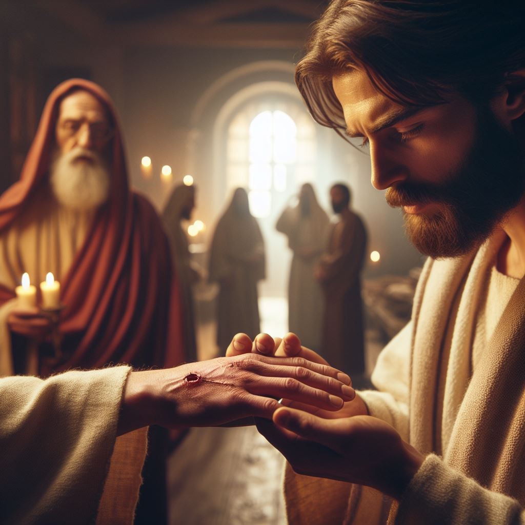 Following Jesus’ resurrection, the disciples are gathered in a locked room in fear. Jesus appears among them, offering peace and showing his wounds. Thomas, initially skeptical, encounters Jesus later and, upon seeing and touching the wounds, professes his belief, prompting Jesus to affirm the blessedness of those who believe without seeing.
