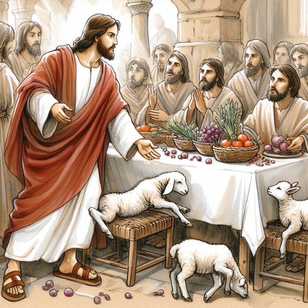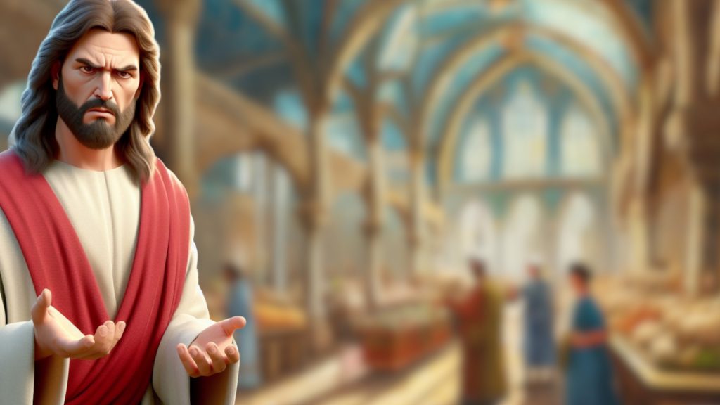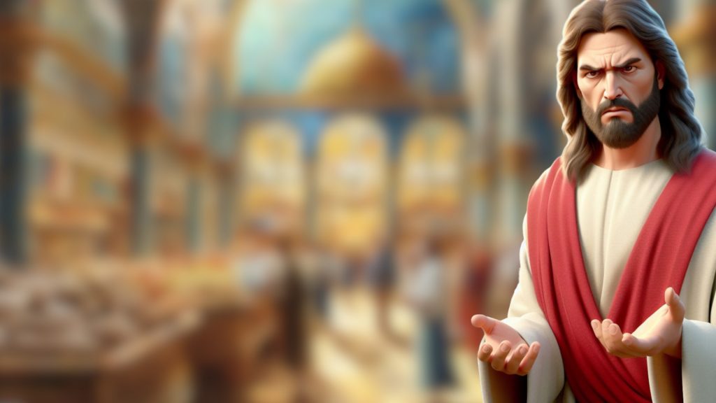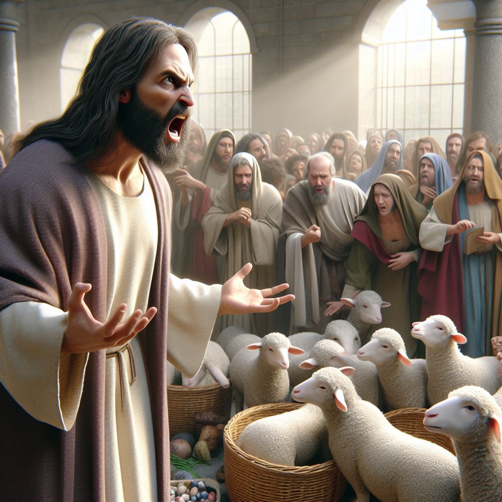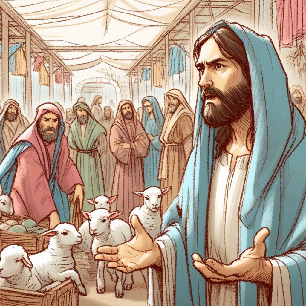 Jesus enters the temple in Jerusalem and finds people selling animals for sacrifices. He overturns the tables, expressing his displeasure at the commercial activities in the sacred space. Jesus also predicts his own resurrection, emphasizing the true significance of the temple as his body.